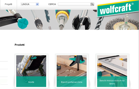 Wolfcraft è un marchio internazionale, quindi la prima cosa da fare una volta entrati nel sito è scegliere la lingua, nel nostro caso l’italiano. Da questo momento possiamo partire con la navigazione. Il sito è molto semplice e chiaro: le sezioni del menù superiore sono due, la prima riservata ai Prodotti e la seconda ai Progetti, in particolare alla posa del laminato, alla lavorazione dei pannelli in cartongesso, al taglio e stoccaggio della legna, al progetto pavimenti in legno e a quello sigillanti e silicone. La sezione Progetti è particolarmente interessante perché rappresentando la gamma di prodotti necessari per un determinato intervento, Wolfcraft sostanzialmente spiega le tecniche e le procedure da seguire per eseguire correttamente l’intervento stesso.
