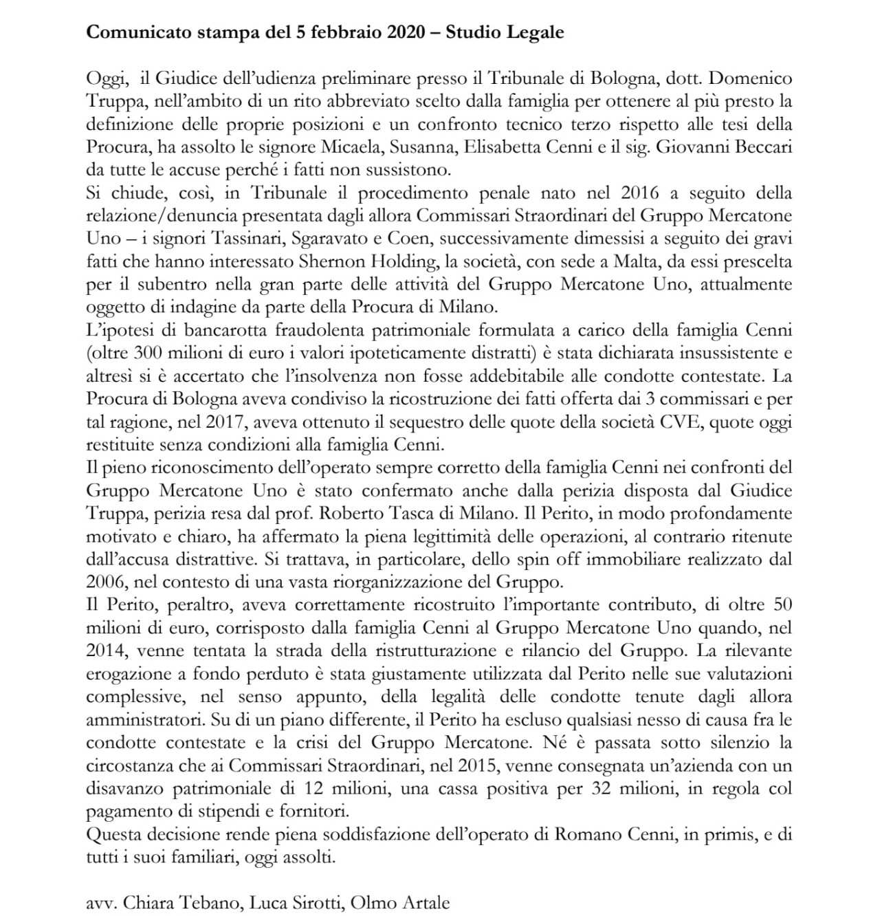 In attesa delle motivazioni, per le quali ci vorranno anche 90 giorni, ieri, 5 febbraio 2020, il Tribunale di Bologna ha assolto, perché “i fatti non sussistono” le sorelle Cenni, figlie del fondatore Romano Cenni. Assolti anche Ilaro Ghiselli, Giovanni Beccari e Gianluca Valentini.
